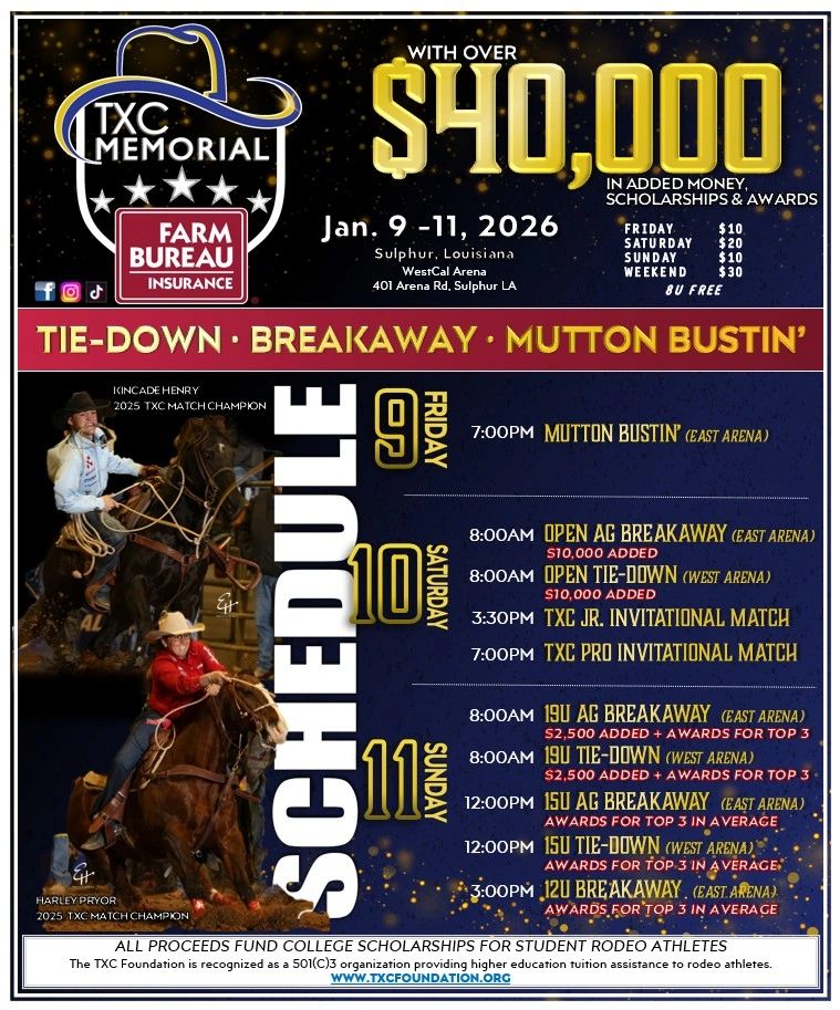 The TXC Memorial Tie-Down and Breakaway + Mutton Bustin will be held in Sulphur, LA at the WestCal Arena.